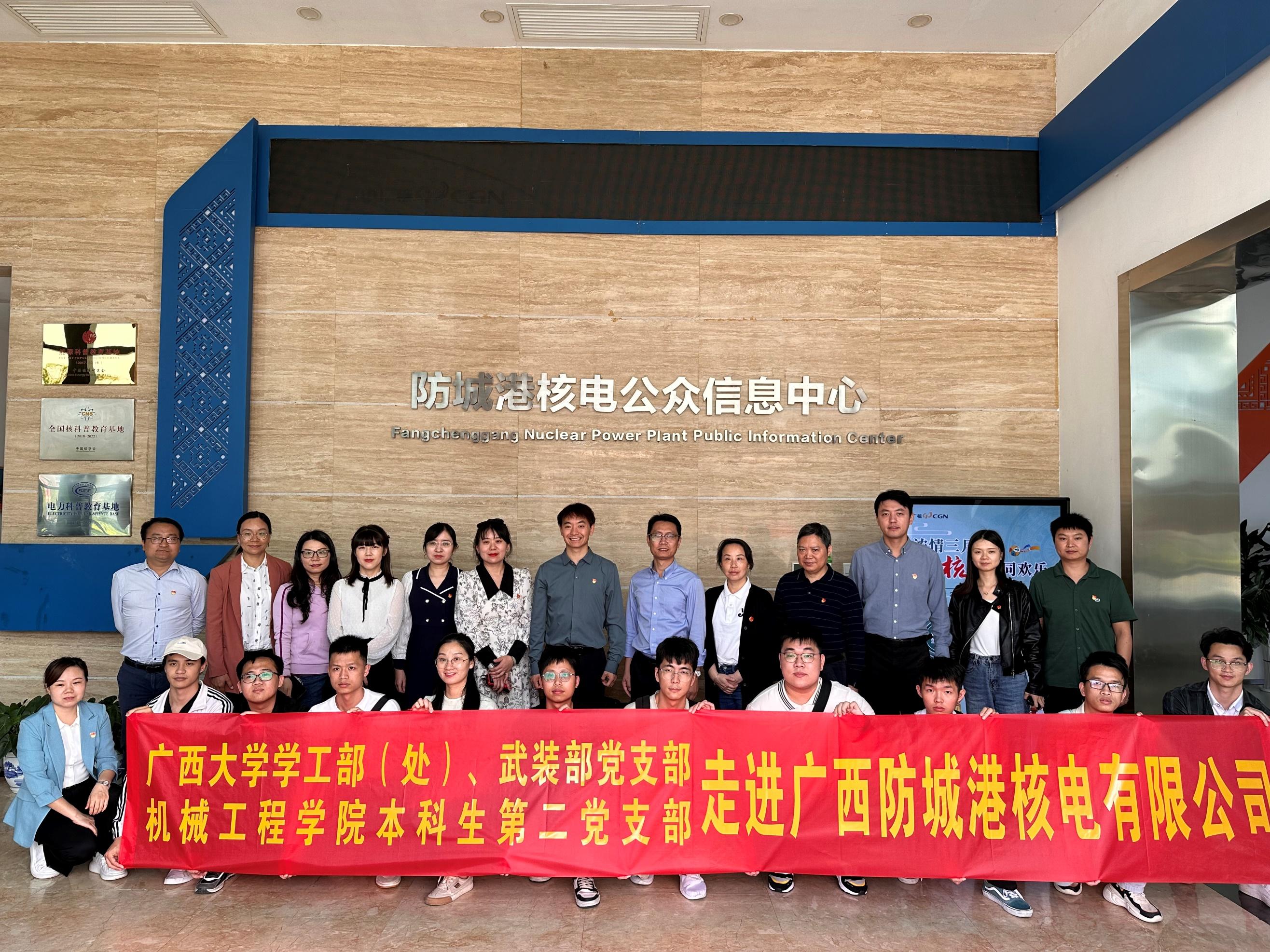 为贯彻落实党中央关于在全党大兴调查研究的工作要求,2023年4月26日,我院本科生第二党支部与学校学工部(处)、武装部党支部在学校学工部(处)、武装部王利军副部(处)长的带领下,共同赴防城港中广核广西防城港核电有限公司开展支部共建活动。