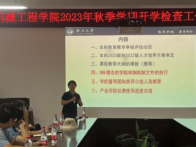 我院于2023年9月4日下午在学院第一会议室召开了系主任工作会议,对2023年秋季学期开学检查内容进行工作布置。会议主要是围绕即将开始的本科教学审核评估、本科2022版培养方案审定、教学大纲格式要求、OBE理念的学院体制机制文件等多个工作任务展开。学院副院长李俚,以及机械制造系主任、机械电子工程系、车辆工程系、能源与动力工程系、机械设计系、机械制图系和实验中心等学院基层教学组织正副系主任出现会议。会议由分管教学的副院长李俚主持。