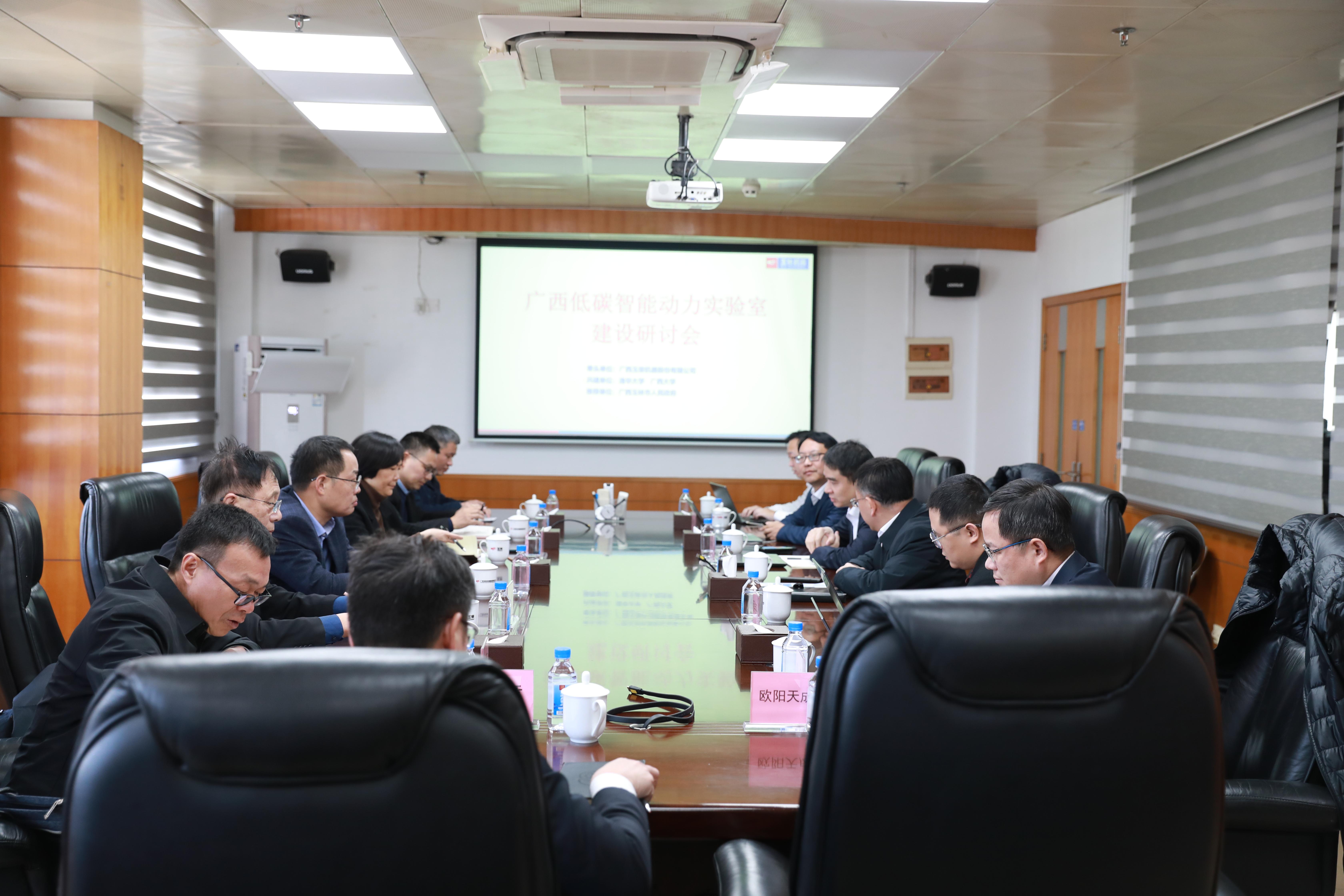 揭牌仪式前,广西大学一行与玉柴高级副总裁钟玉伟,总工林铁坚等座谈,就广西实验室的建设进行研讨。