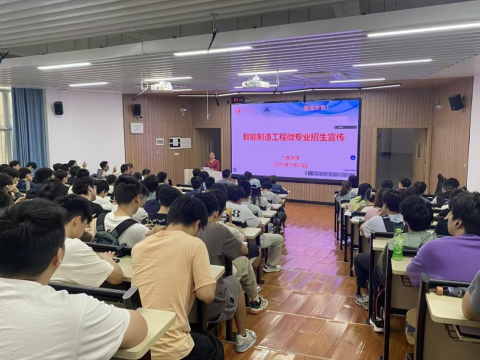 2025年5月25日上午,我院在第十教学楼10A-101教室召开《智能制造工程》微专业招生宣传会,会议邀请了教务处谢健副处长、兄弟学院副院长、北京华航唯实机器人科技股份有限公司、国投融合科技股份有限公司、海尔智家股份有限公司等合作企业参加,会议由学院党委副书记黄路明主持,副院长李俚作总结讲话,院长助理项载毓老师做大会的技术支持,全校相关专业将近200名学生到现场参加招生宣传会。