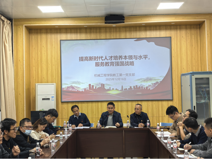 为帮助党员同志精准领悟怀部长本次报告的核心要义,延伸学习习近平总书记党中央、教育部等关于教育强国战略的相关文件精神,支部特邀党建理论领域专家、国家“万人计划”哲学社科领军人才、我校马克思主义学院副院长兼党支部书记丁彬教授为研讨进行导学。丁教授结合培训要点,从理论渊源到核心内涵,从政策解读到实践路径深入阐释习近平总书记关于教育的重要论述的核心要义以及怀进鹏部长讲话的重点内容,进一步深化了党员同志们对习近平新时代中国特色社会主义思想及“教育-科技-人才”一体化战略的领悟。此外还结合广西大学机械类新工科人才培养的思政课程和课程思政改革,解构党员教师在贯彻落实教育强国战略中所肩负的使命和责任。